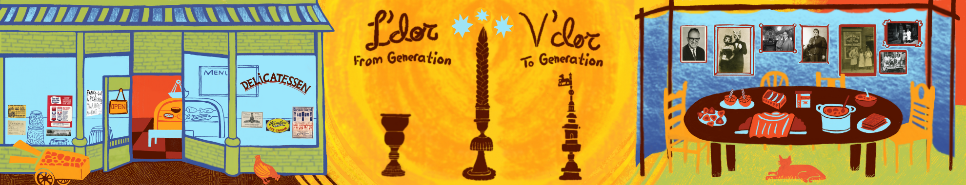 In the center, the mural illustrates the Havdalah ritual, which translates to “separation” in Hebrew and marks the conclusion of Shabbat, distinguishing it from the beginning of the new week. Here, the Havdalah ritual symbolizes a transition from the past to the future. Above this section, the words “L’dor, V’dor,” a Hebrew phrase, are displayed alongside its English translation, “From Generation to Generation.”